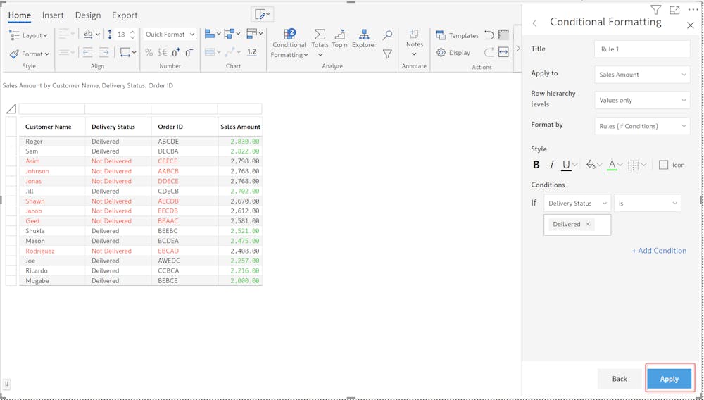 4. Finally, we can select the required text values to create our If condition. In this case we will choose Delivery Status as our If statement and Delivered as our requisite condition. Also change the color formatting to Green:
