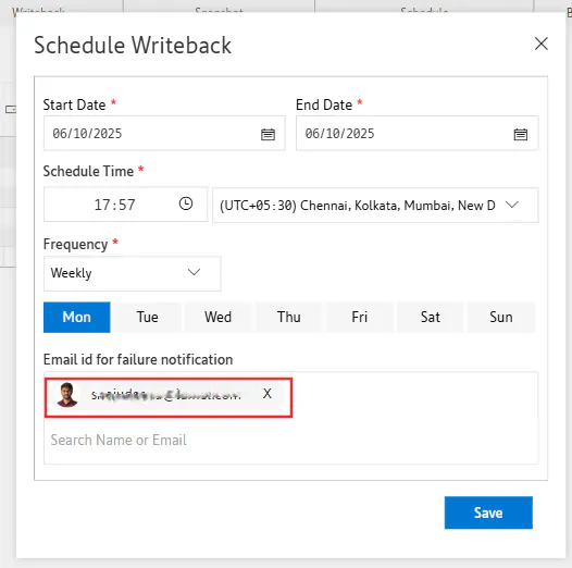 You can configure email notifications to alert specific users when a scheduled writeback fails.