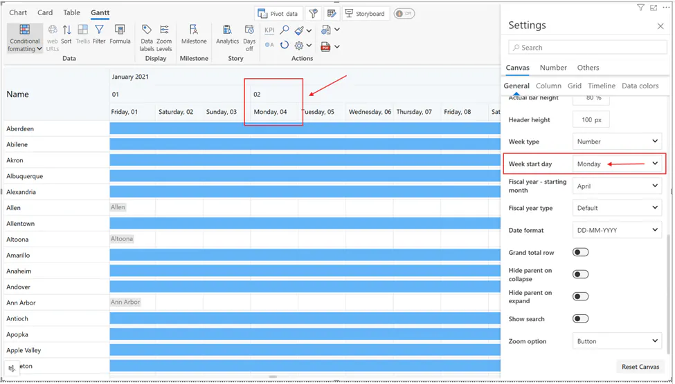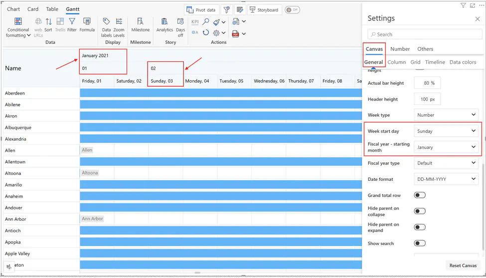 For more details, check out the doc: Week start day | Fiscal year - starting month - Gantt: General settings | Inforiver