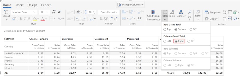 In Inforiver Matrix we can either activate or disable the Row Grand Total through the Totals feature located under the Home tab: